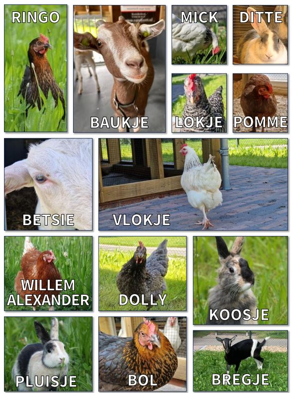 Om de dieren van dierenweide Boer Antoon Park beter te leren kennen, hebben we een poster laten maken met alle dieren en hun naam. Zo kan je als je op bezoek bent de dieren herkennen en bij de naam noemen. Wil je meer weten over Geiten, kippen en konijnen, lees dan de dierenweetjes van Bart.